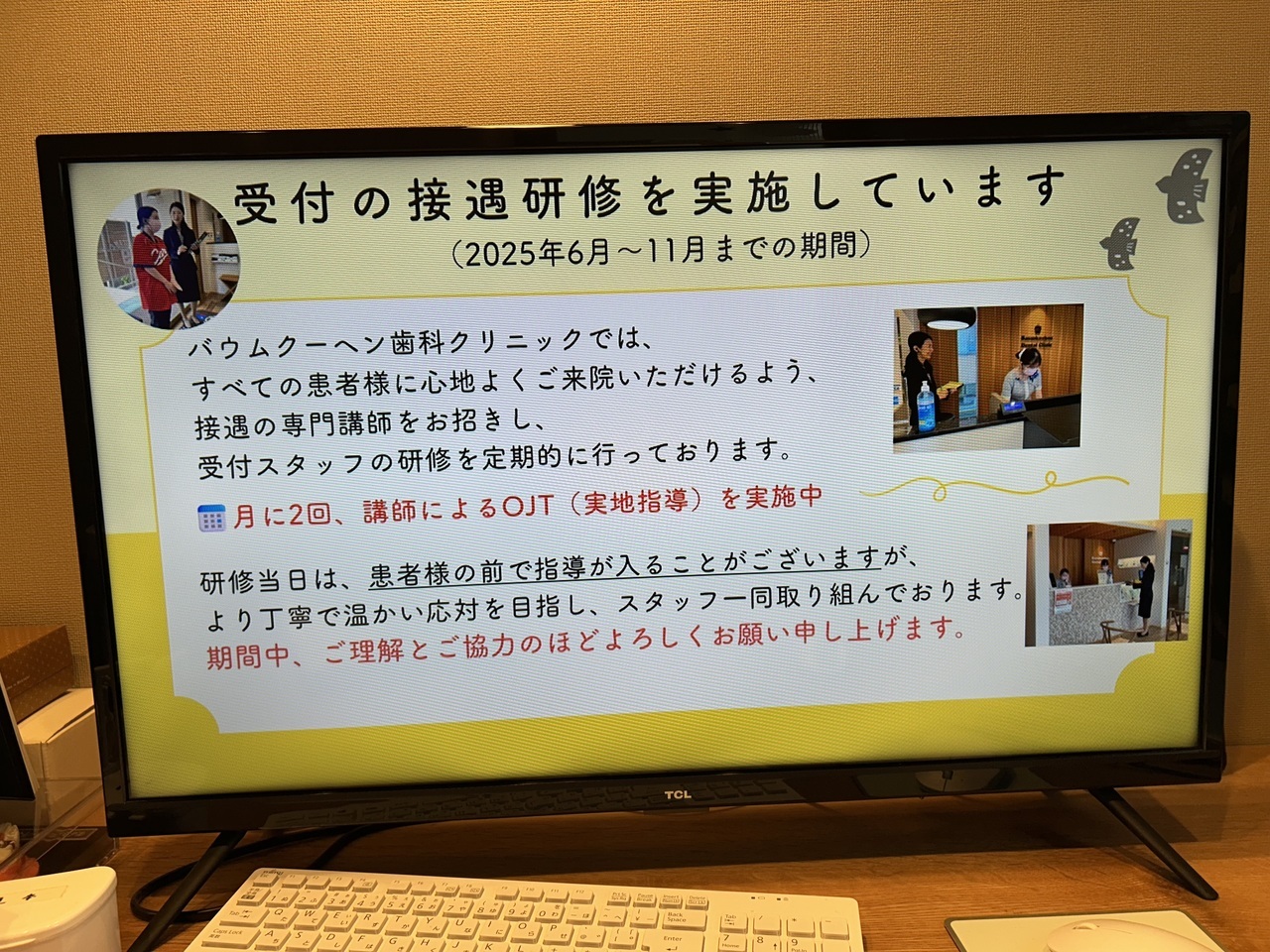 当初、受付スタッフさんへのOJT指導からスタートし、その後、歯科衛生士さん、歯科アシスタントさんとOJT指導をさせていただきました。OJT指導後、最終的にはスタッフ全員が集まり、半日間の集合研修をいたしました。