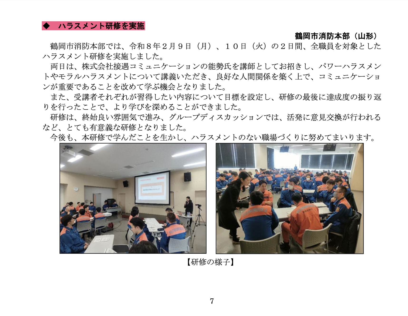 鶴岡市消防本部にて「ハラスメント研修〜パワーハラスメントだけではないモラルハラスメントへの理解も深めよう」のテーマで2時間研修を2日間行いました。